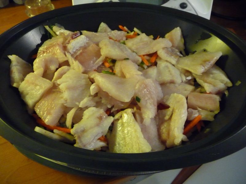 - Faire cuire également à la vapeur la julienne de légumes et les filets de colin.