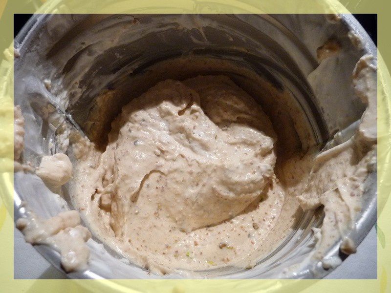 3. Mettre les meringues, mixer environ 1 minute à la vitesse 5-6, puis ajouter le pralin, les pistaches et les amandes, mixer à la vitesse 4-5 environ 45 secondes.