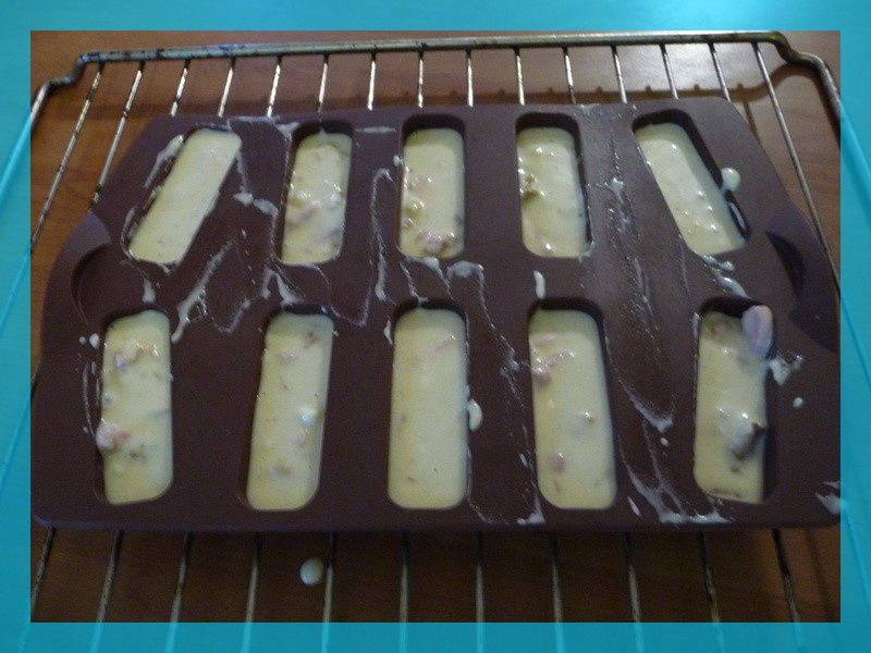 - Déposer le moule à mini cakes sur la grille du four et répartir la préparation dans les alvéoles.
