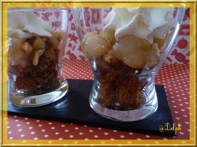 - Couper le pain d’épices en petits carrés, les mettre au fond de la verrine.