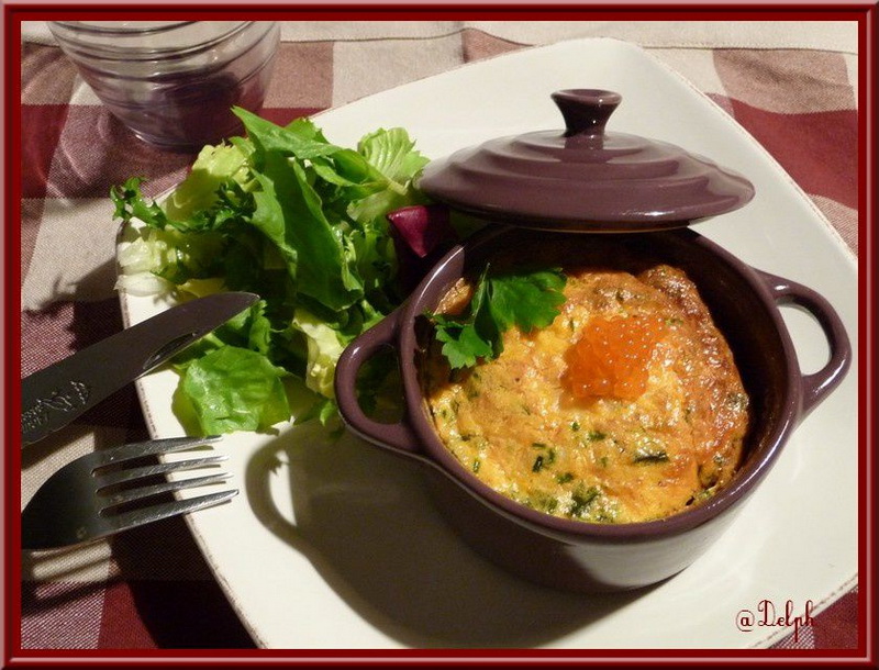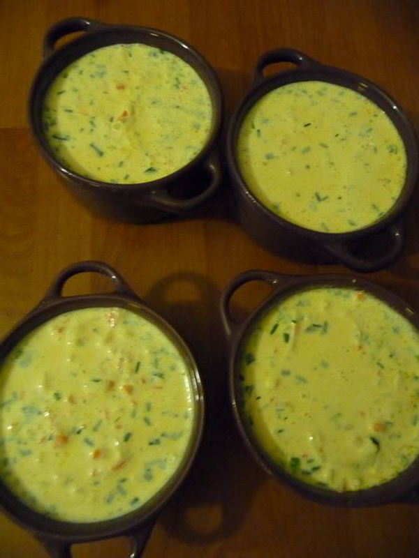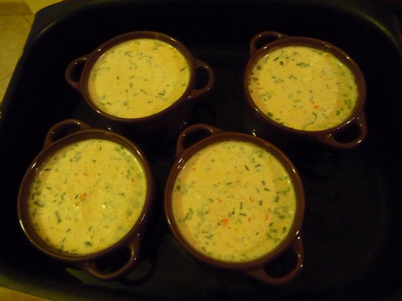 - Remplir 4 mini cocottes légèrement beurrées, les placer dans un bain-marie, puis les mettre au four pour 30 minutes. A la sortie du four, laisser refroidir puis les placer au frais deux heures minimum.