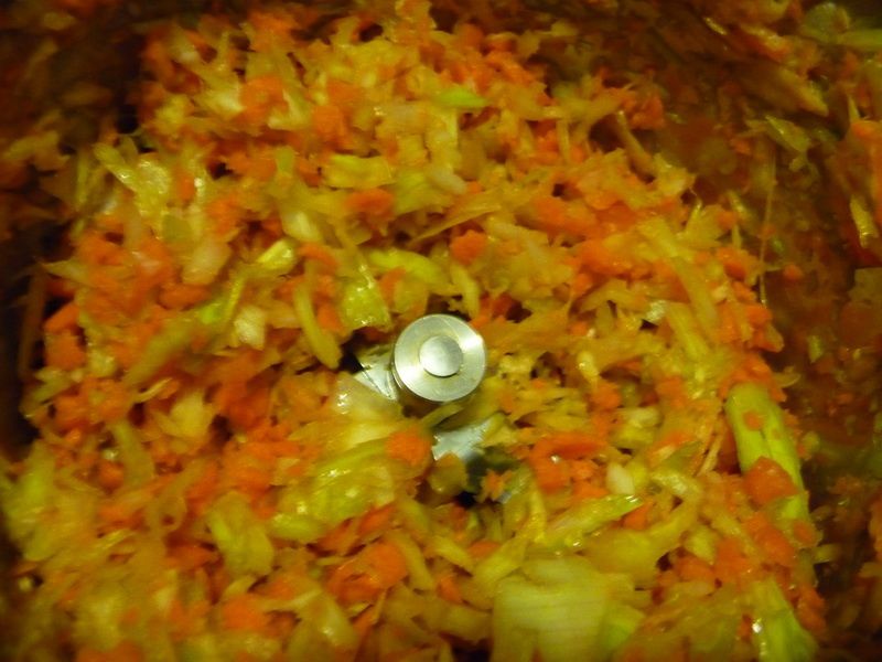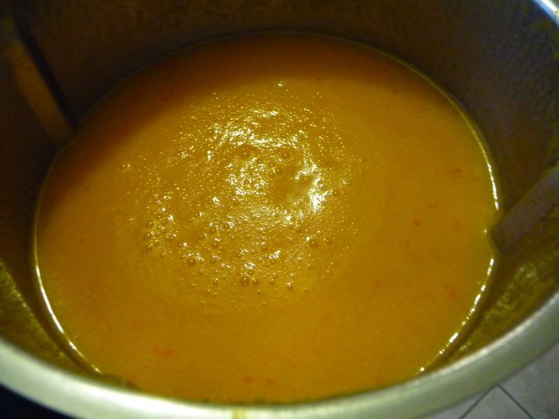 - Mettre dans le bol du Thermomix les carottes et le poireau puis mixer 5sec/Vit5., ajouter le poivron, le chou-fleur, le curcuma et le sel puis ajouter l’eau et faire chauffer 18min/Varoma/mijotage. A la sonnerie, mixer 15sec/Vit5, puis augmenter la vitesse à 9 pendant encore 30secondes.