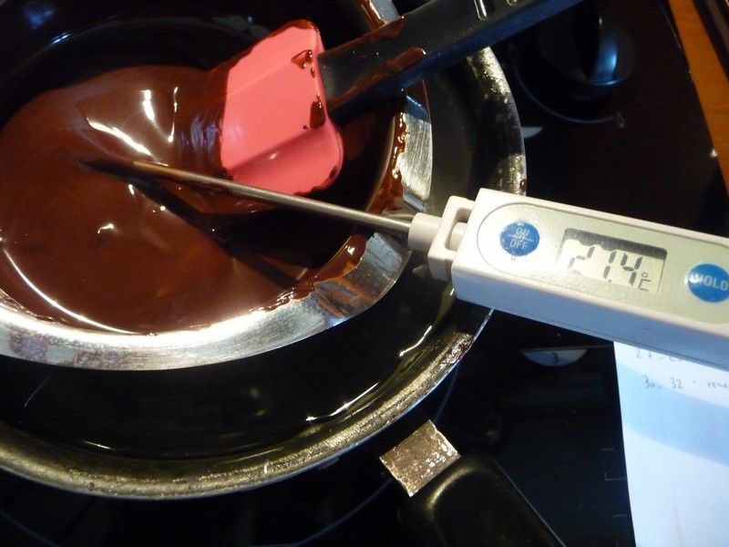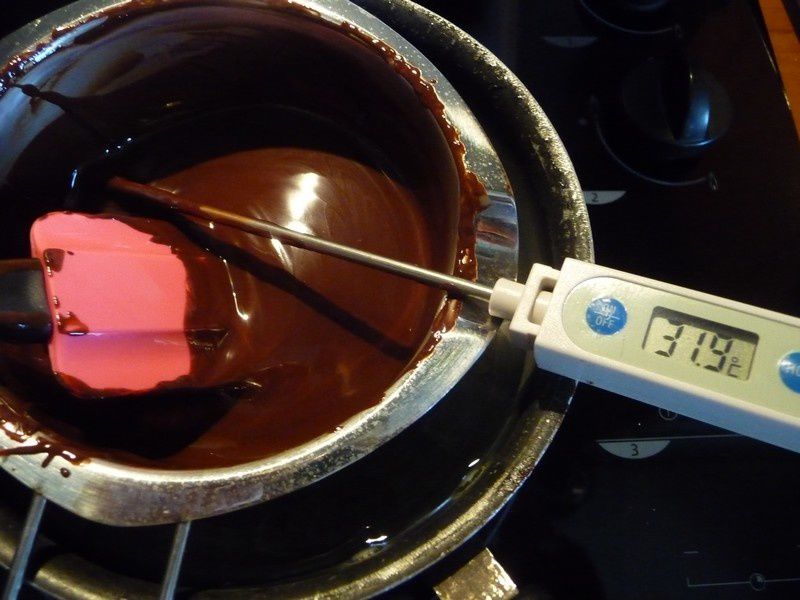 - Une fois le chocolat refroidi, le remettre au bain-marie quelques minutes jusqu’à ce qu’il soit à sa température de cristallisation et donc de travail, 30/32°C.