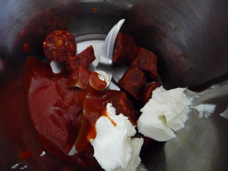 - Le mettre dans le bol avec le fromage frais, et le coulis de tomate mixer 30sec/Vit5, racler les bords avec la spatule puis mixer à nouveau 4sec/Vit 6, racler les bords et mixer 4sec/Vit6.