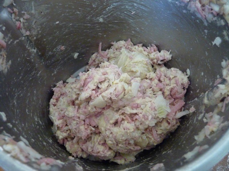 - Faire le deuxième pâton au jambon: Placer le deuxième oignon, mixer 5sec/Vit5, ajouter le deuxième pâton, puis le jambon râpé puis pétrir 30sec/bol fermé, avec l’aide de la spatule, poser votre pâte sur une surface fariné.