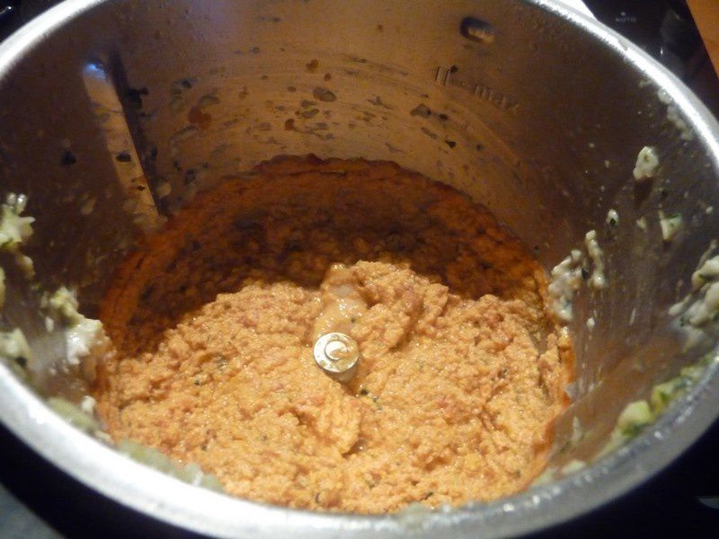 - Peler l’oignon, le couper en 2 et le mettre dans le bol avec le basilic mixer 5sec/Vit 5, racler les bords du bol avec la spatule, ajouter l’huile d’olive puis faire chauffer 3min/80°C/vit1.