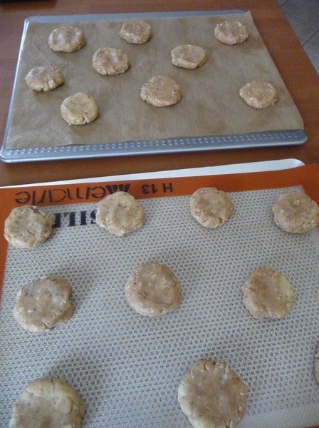 - Faire des boules espacés sur la toile silpat ou du papier sulfurisé, les aplatir légèrement.