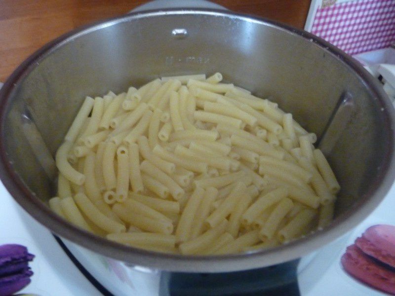 - Pour faire cuire les pâtes, mettre l’eau dans le bol et la faire chauffer 10min/Varoma/Vit1, à la sonnerie ajouter les macaronis puis faire cuire 9min/100°C/mijotage/couteau inversé sans le gobelet. Égoutter les pâtes, les réserver et rincer le bol.