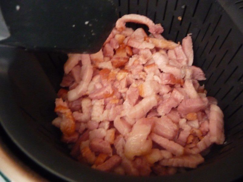 - Mettre les lardons dans le bol puis faire chauffer 3min30/100°C/mijotage/couteau inversé, égoutter les lardons à l’aide du panier cuisson, réserver avec les pâtes.