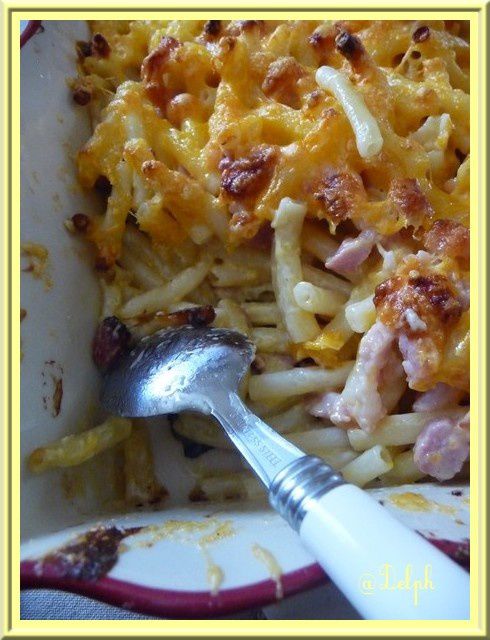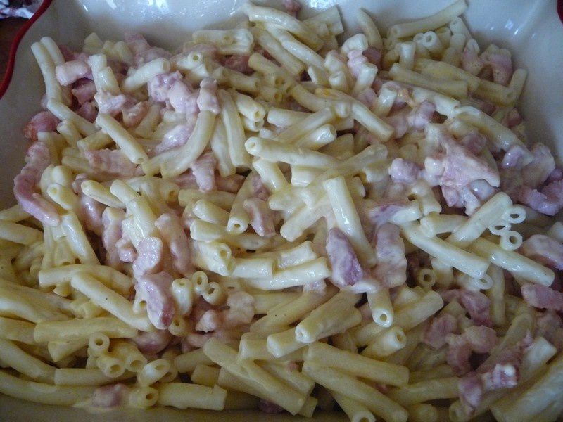 - Verser sur les macaronis et ajouter les lardons. Déposer dans un plat et parsemer de cheddar râpé.