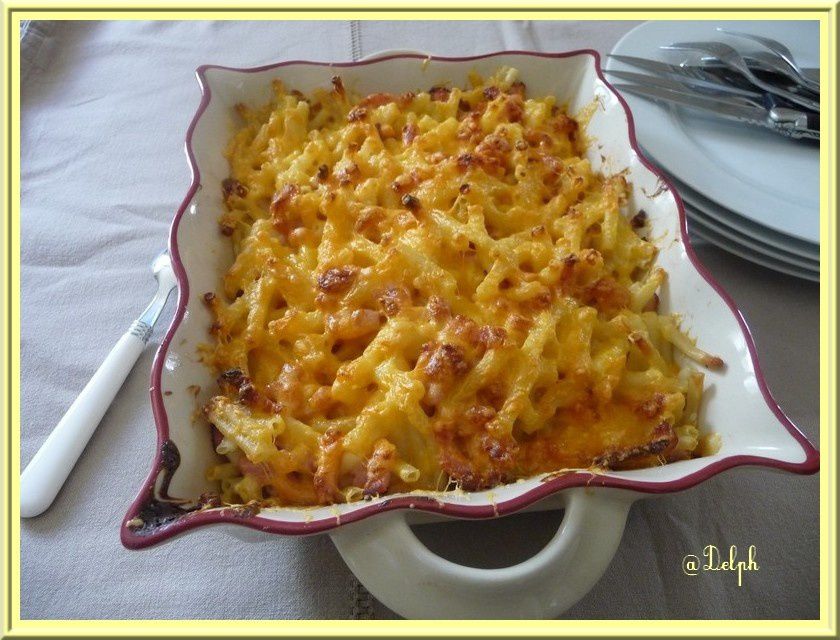 - Verser sur les macaronis et ajouter les lardons. Déposer dans un plat et parsemer de cheddar râpé.