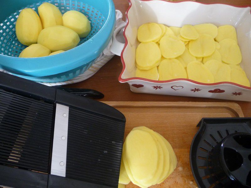 - et couper les pommes de terre en fines rondelles (j’ai utilisé la mandoline).