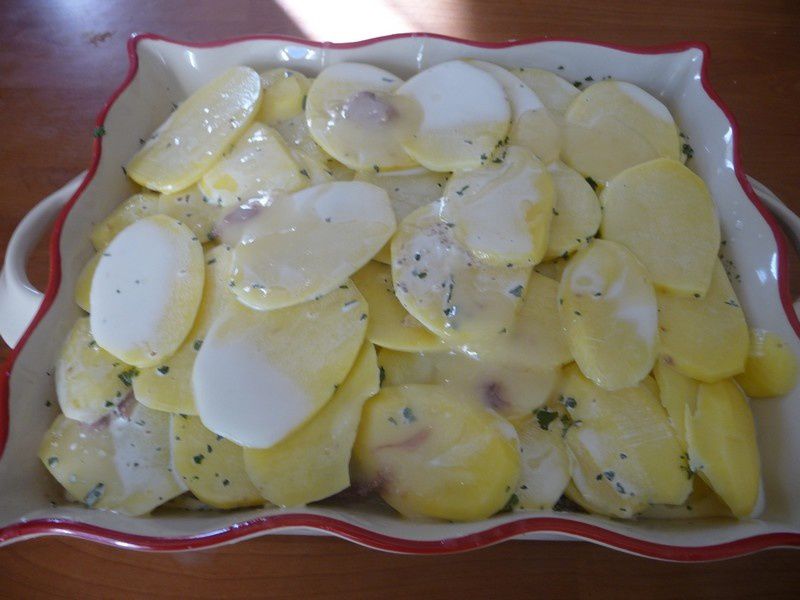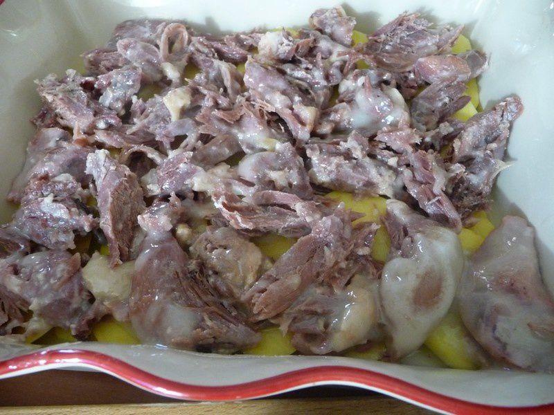 - Graisser le plat avec un peu de graisse du confit. Le remplir en alternant par couches les pommes de terre et le canard. Verser la crème liquide qui doit tout juste couvrir le gratin.