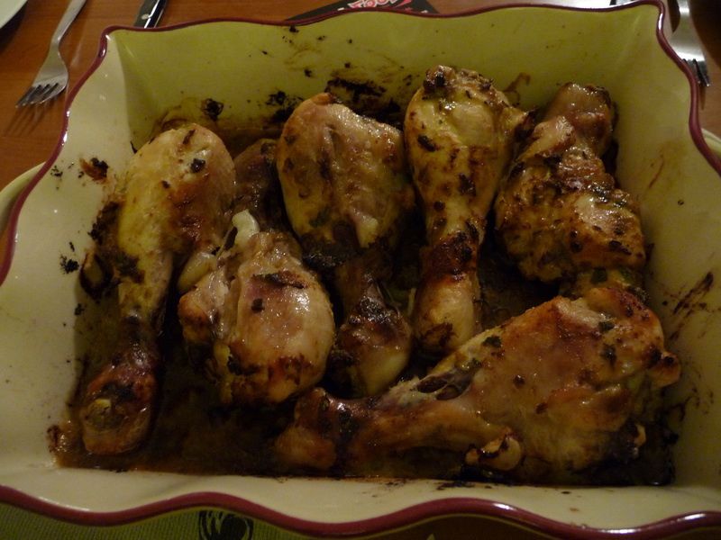 - Faire cuire au four à 190°C pendant 35 minutes en arrosant avec la marinade de temps en temps, puis poursuivre la cuisson à 220°C pendant 15 minutes environ, selon la grosseur de vos pilons, il faudra plus ou moins augmenter le temps de cuisson.