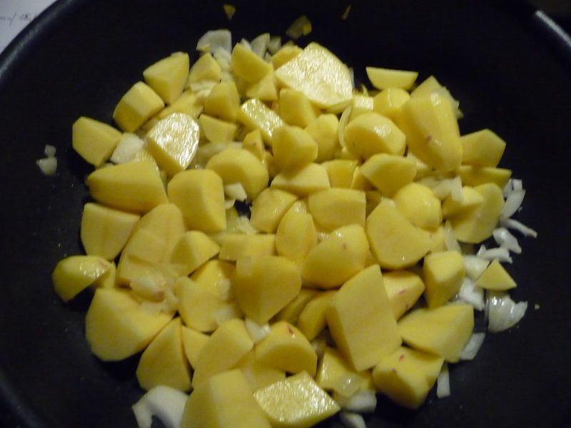 - Laver et éplucher les pommes de terre, les couper en dés puis les ajouter aux oignons.