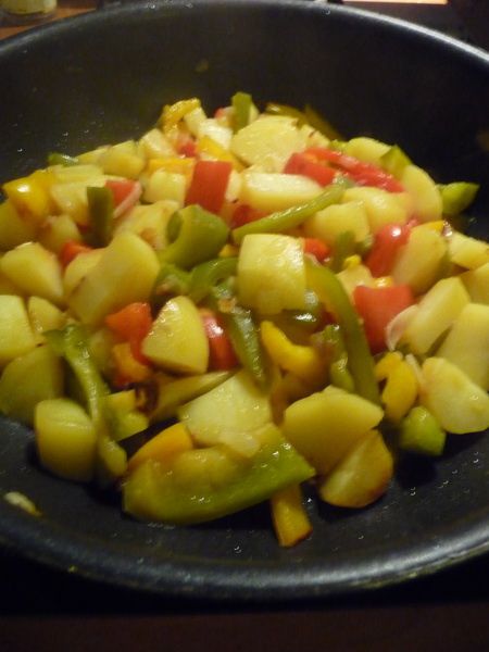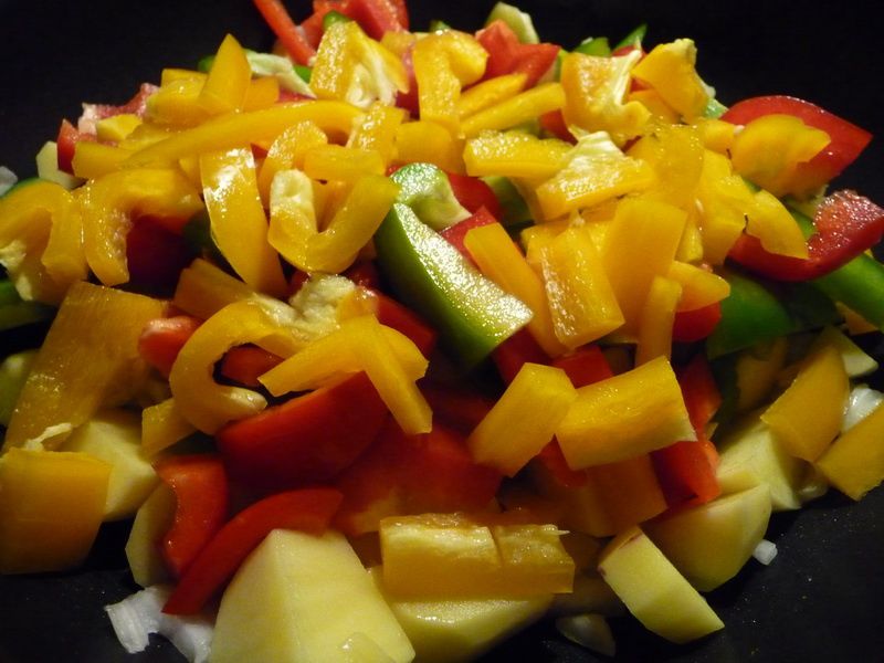 - Laver et couper les poivrons en fines lanières, les ajouter aux pommes de terre et oignons. Saler poivrer.
