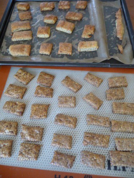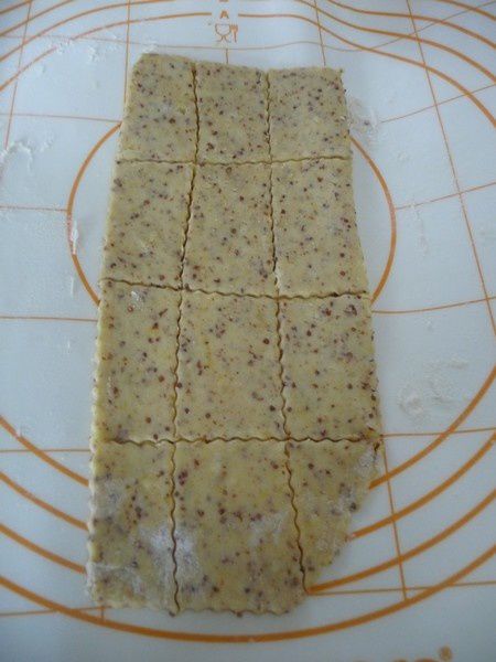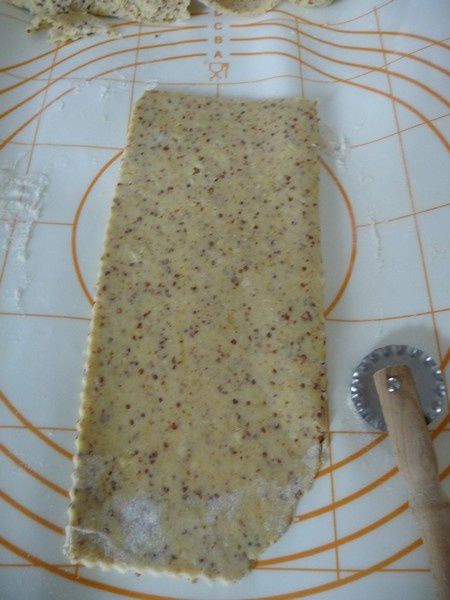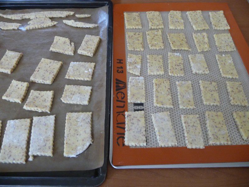 - A l’aide d’une roulette crantée par exemple, découper des bandes puis des rectangles (d’environ 2-3 cm sur 5-6 cm). Les déposer sur une plaque antiadhésive ou couverte de papier cuisson.