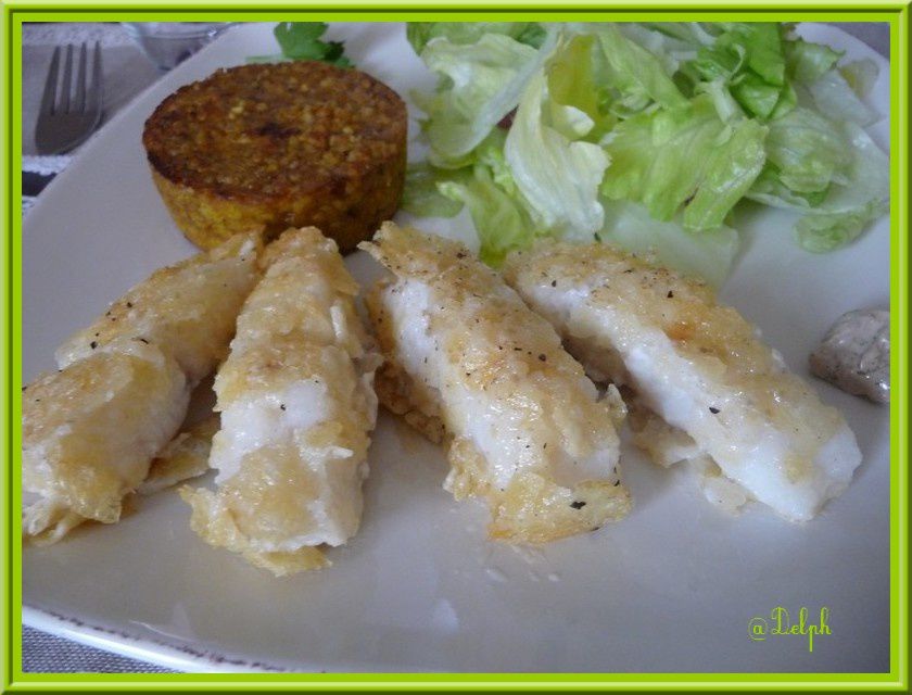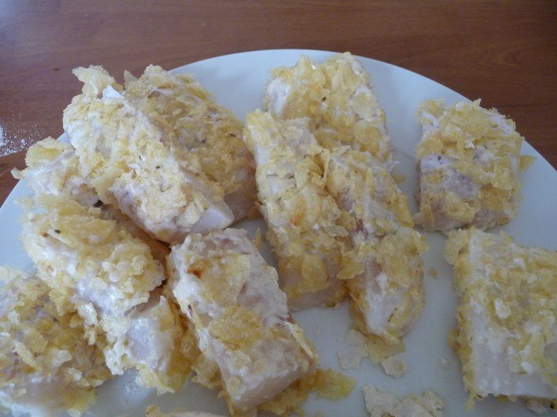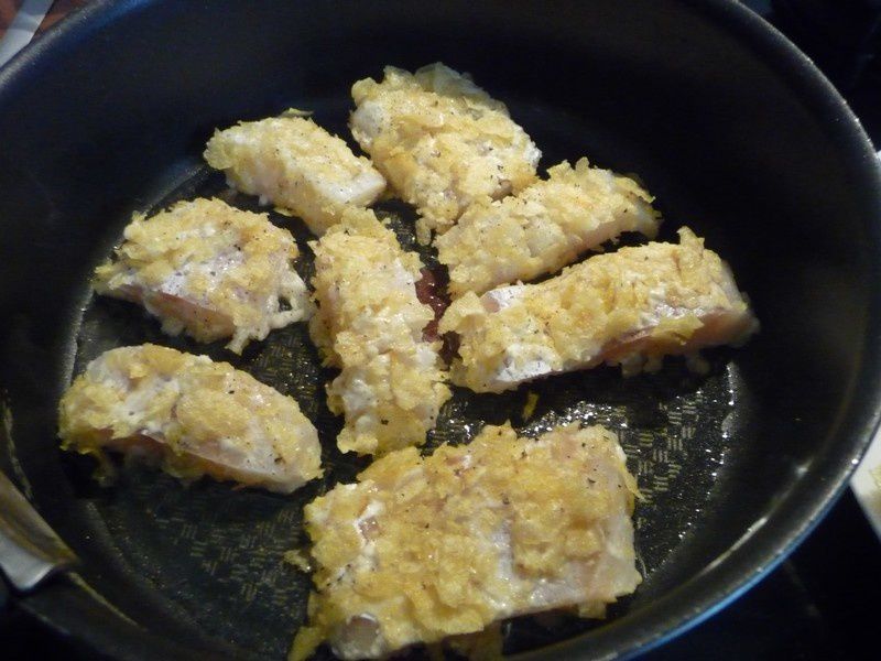 - Préparer dans des récipients plats un « bac » de farine, un de blanc d’œuf légèrement fouetté et un de « chapelure » de chips. Rouler chaque morceau de poisson séparément dans la farine, puis le blanc d’œuf, puis les chips.