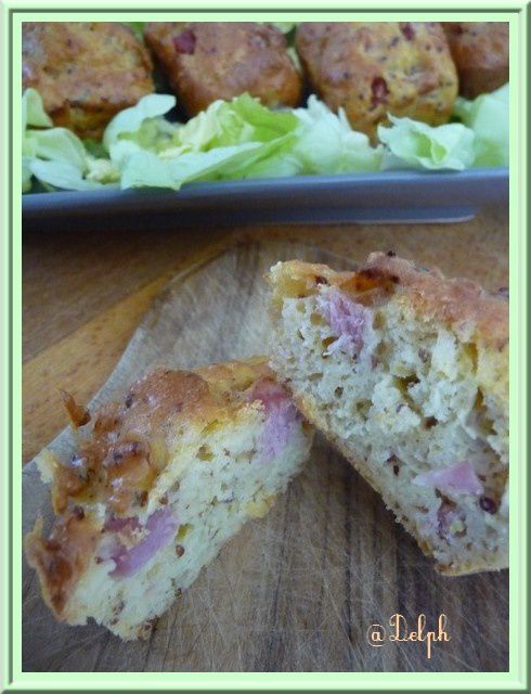 - Dans un saladier, casser les œufs et ajouter la moutarde. Bien mélanger. Ajouter la farine et la levure. Mélanger. Incorporer le gruyère et le jambon coupés en petits dés.
