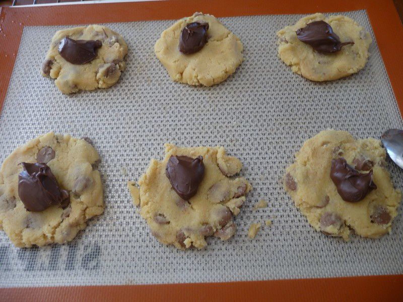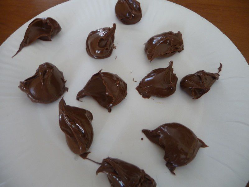 - Sur une assiette, déposer 11 noisettes de pâte à tartiner de la contenance d’une cuillère à café puis entreposer au congélateur le temps de préparer la pâte à cookies.