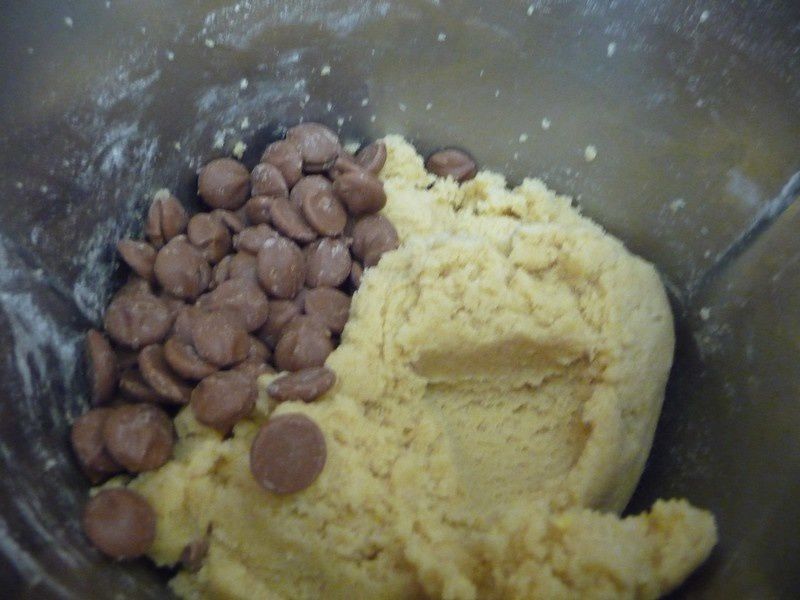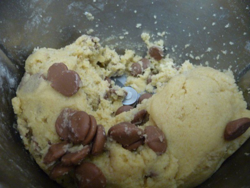 - Couper le chocolat au lait en gros morceaux et incorporer à la pâte puis mélanger 30sec/Vit3/couteau inversé . Placer au frigo pour une demi heure.