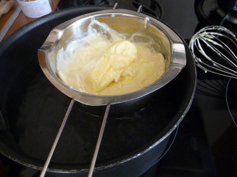 - Faire fondre le chocolat blanc cassé en morceaux avec le beurre au bain-marie, et bien mélanger pour obtenir une texture lisse et brillante. Laisser tiédir.