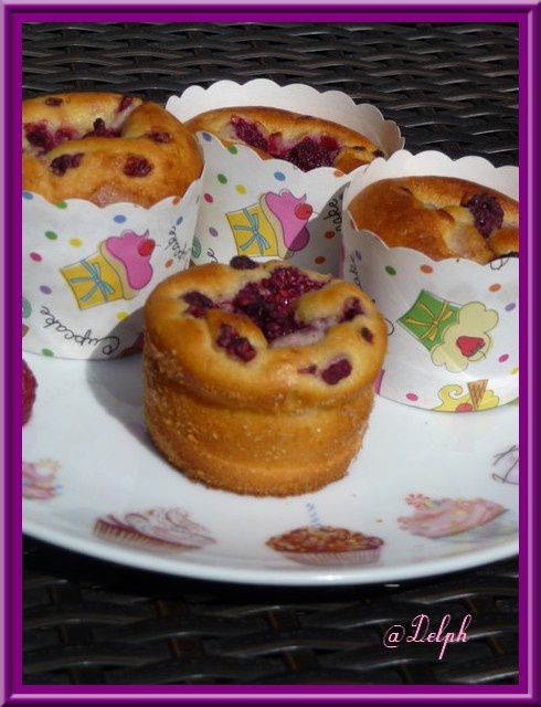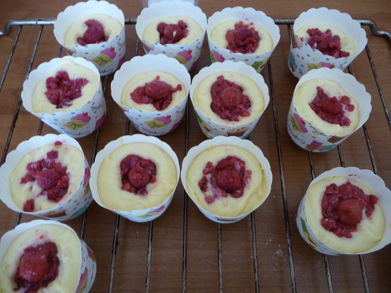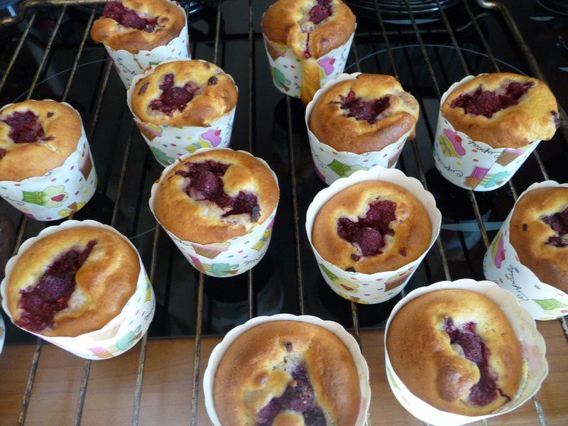 - Verser la pâte dans les moules jusqu’aux 3/4, enfoncer quelques framboises et enfourner pour 20-25 minutes environ.