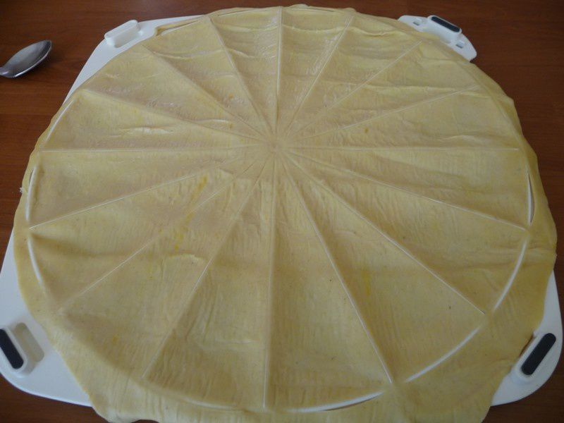 - Badigeonner le centre du disque avec un peu d’eau pour pouvoir souder correctement les croissants une fois roulés.