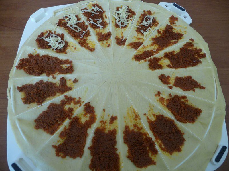 - Étaler une cuillère à café de votre préparation de la base jusqu’au milieu du triangle.