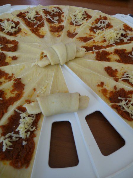 Si vous n’avez pas le croissants party de chez tupp , ce n’est pas un problème (c’est juste plus pratique!) : il suffit de découper la pâte en 2 puis en 4 puis chaque quart en 4 et vous obtiendrez 16 triangles de pâte que vous pourrez garnir.