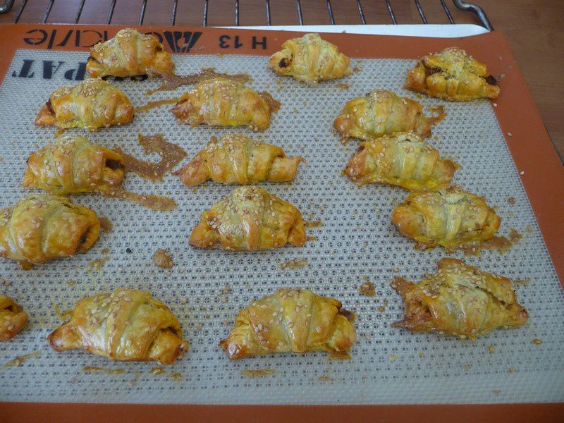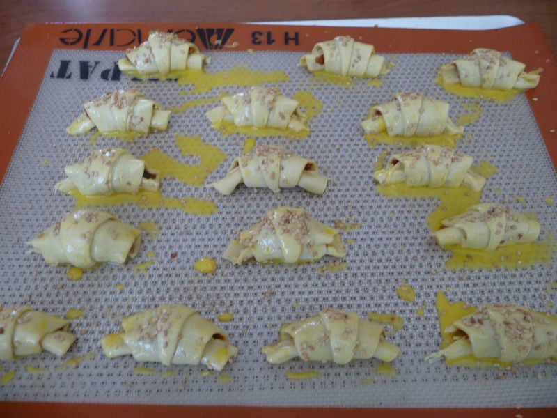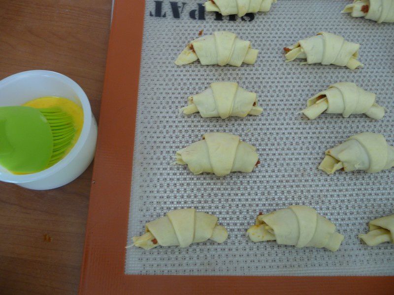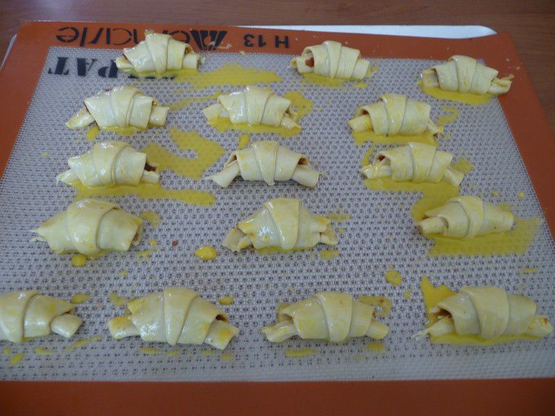 - Rouler les croissants en commençant par la partie large , les déposer sur une plaque à four recouverte de papier sulfurisé .