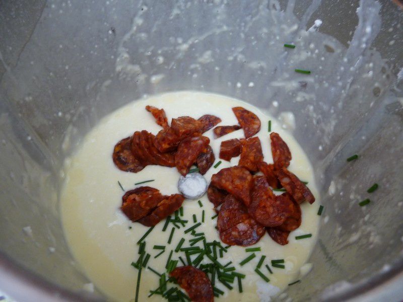 - Ajouter le fromage de chèvre , puis mélanger 15sec/vit 4, incorporer le chorizo coupé en dés et la ciboulette ciselée puis mélanger à nouveau 20sec/Vit3/couteau inversé.