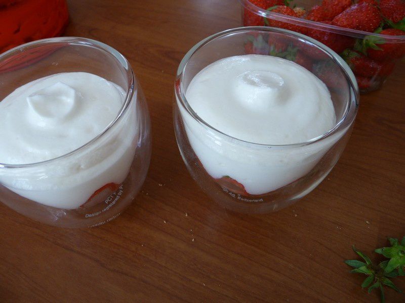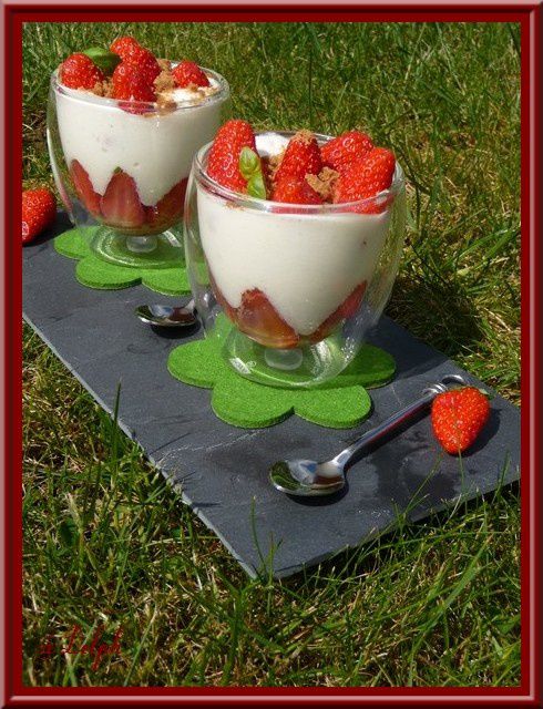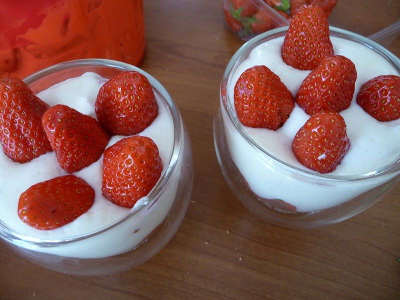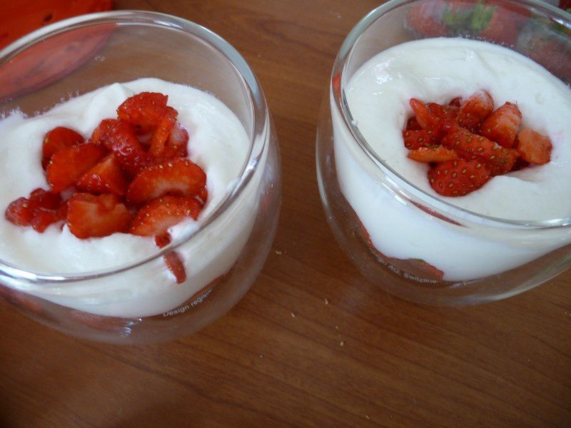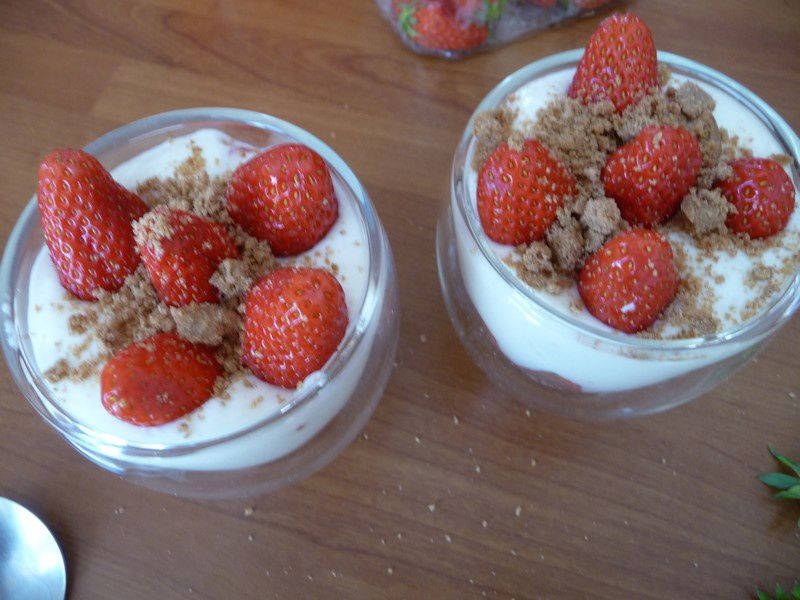 - Incorporer la moitié de fromage blanc, mettre des bouts de fraise puis recouvrir avec le reste de fromage blanc, mettre des fraises entières puis parsemer du reste des miettes de spéculoos.