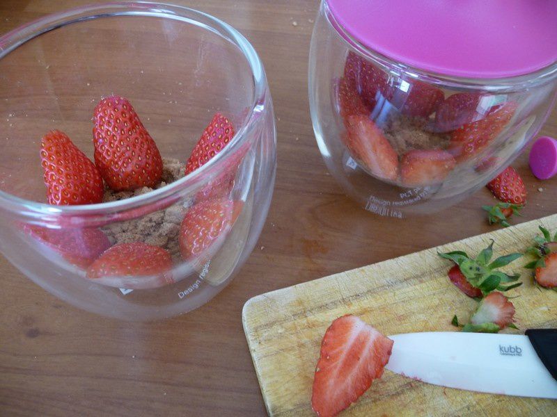 - Mettre une cuillère à soupe de spéculoos au fond de votre verrine puis caler des fraises coupées dans le sens de la longueur contre la paroi de votre verrine.