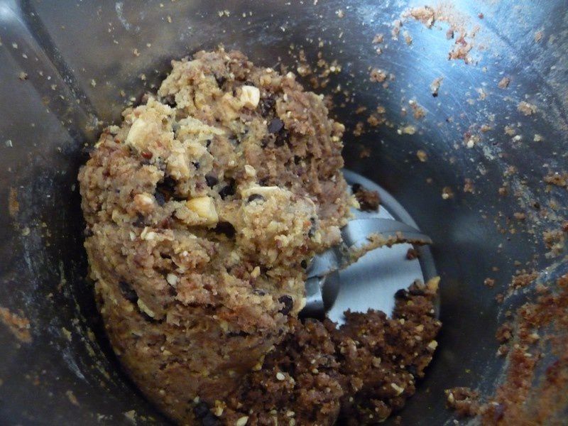 - Ajouter l’oeuf, la farine, le sel, la levure, les cacahuètes, les pépites et les carambars mélanger le tout 25sec/Vit4.
