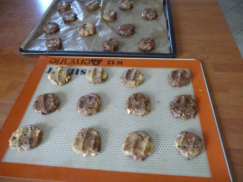 - Façonner des boules de pâte et les aplatir légèrement sur une plaque recouverte de papier sulfurisé.