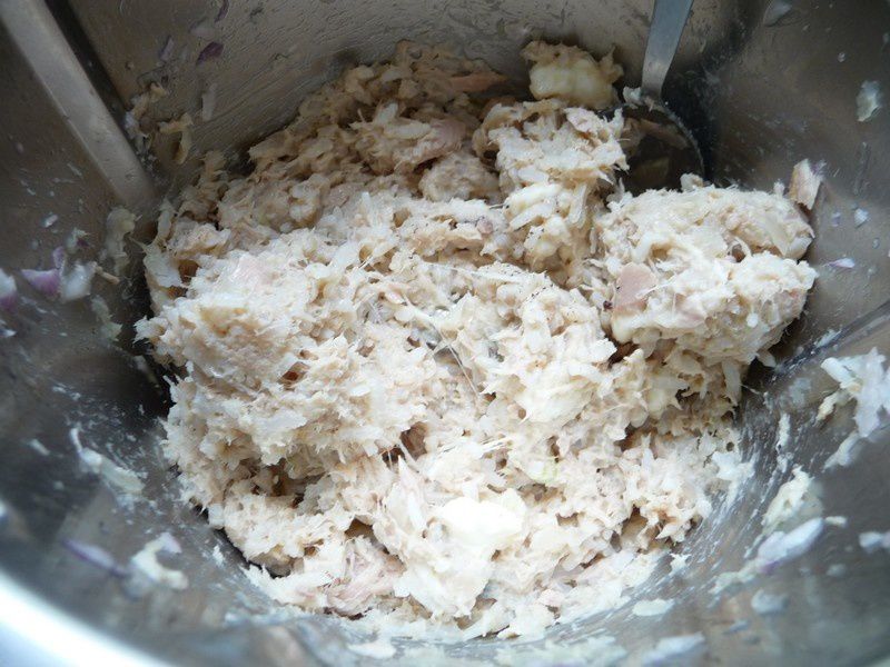 - Faire revenir les échalotes dans un poêle chaude avec l’huile d’olive. Ajouter l’ail finement haché et le thon égoutté et émietté.