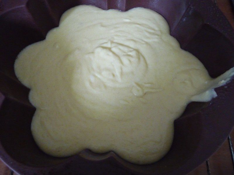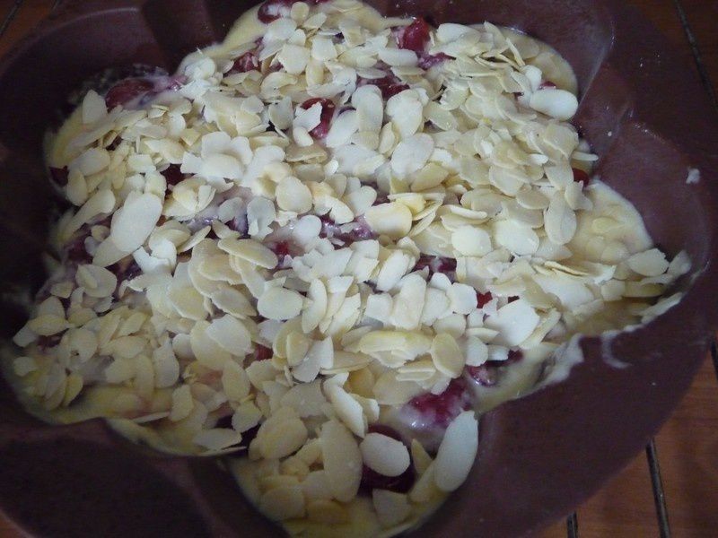 - Verser la préparation dans un moule en silicone et ajouter les cerises coupées en 2 et les enfoncer dans la pâte.