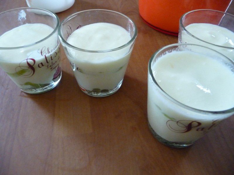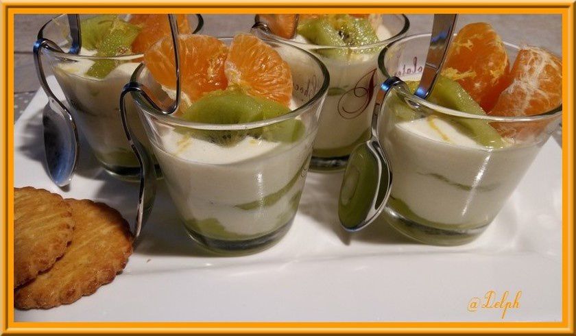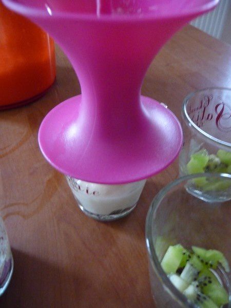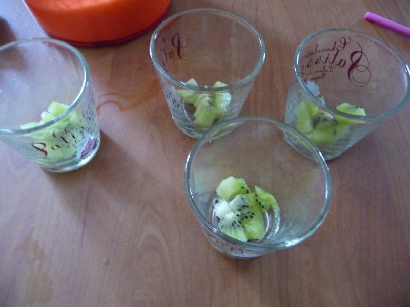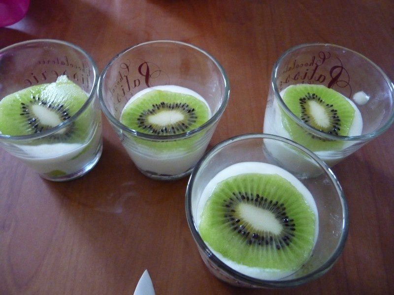 - Couper des kiwis en petits carrés pour les mettre au fond des verrines, verser une couche de mousse mettre une tranche fine de Kiwi et finir par de la mousse