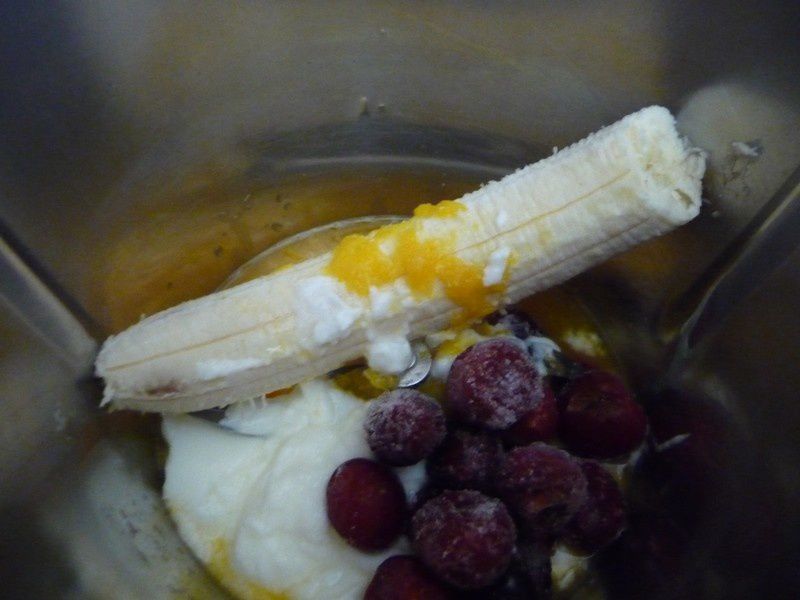 - Ajouter les cerises surgelés, les yaourts et la banane coupée en rondelles