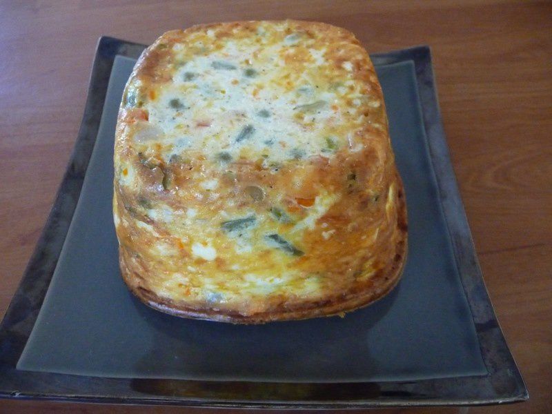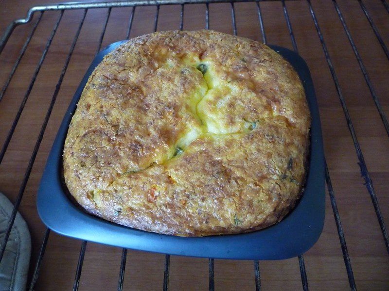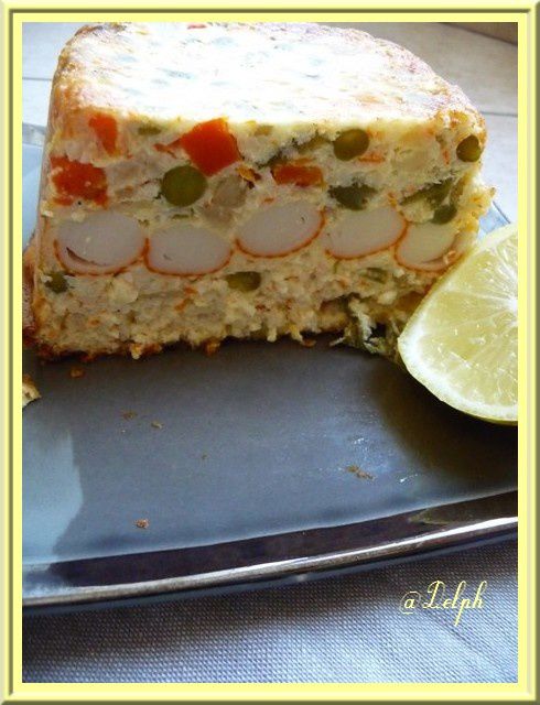 3. Verser la moitié de cette préparation dans un moule à cake, déposer les surimis restants, recouvrir du reste de la préparation et enfourner 25 /30 minutes .J’ai prolongé de 30 minutes car j’ai utilisé ma terrine Ultra pro qui est un peu haute. Servir bien froid de préférence , avec une salade verte .