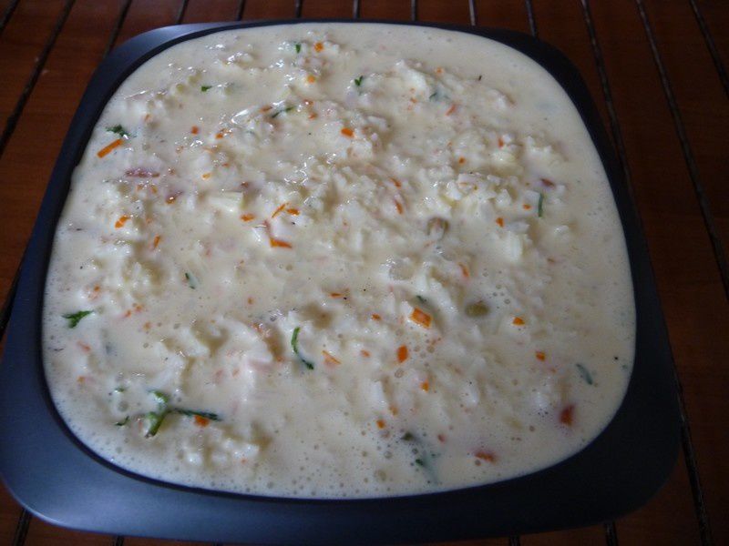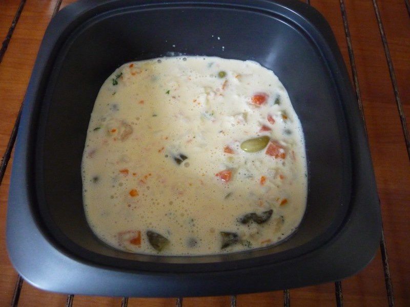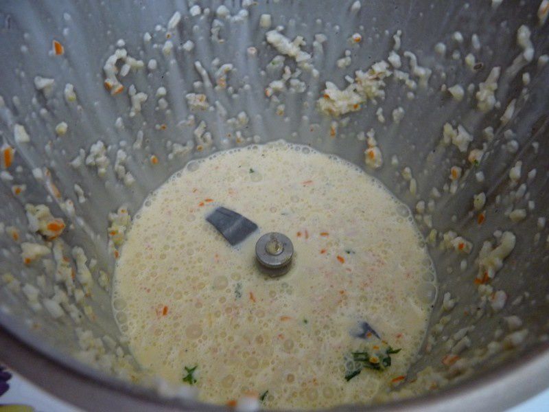 2. Mixer la moitié du surimi avec les œufs, le râpé, le persil et la crème, assaisonner et ajouter la macédoine .