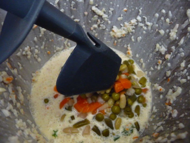2. Mettre dans le bol la moitié du surimi avec les œufs, le râpé, le persil et la crème, assaisonner. Mixer 10sec/Vit5. A la sonnerie ajouter la macédoine avec la spatule.
