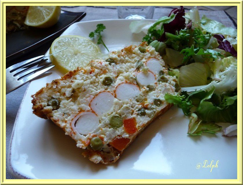 3. Verser la moitié de cette préparation dans un moule à cake, déposer les surimis restants, recouvrir du reste de la préparation et enfourner 25 /30 minutes .J’ai prolongé de 30 minutes car j’ai utilisé ma terrine Ultra pro qui est un peu haute. Servir bien froid de préférence , avec une salade verte .
