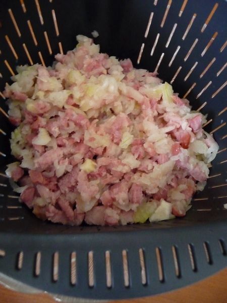 3. Faire revenir quelques minutes les lardons avec l’oignon émincé, dégraisser. Ajouter les lardons et les oignons à votre précédente préparation.