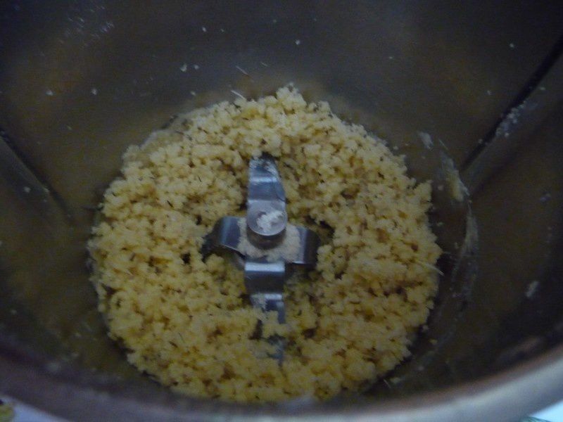 - Mettre le beurre dans le bol puis le faire fondre 3min/60°C/Vit1. A la sonnerie, ajouter la poudre d’amande, la farine, le parmesan, les herbes de Provence et le poivre puis mélanger 20sec/Vit 4. Insérer le fouet puis incorporer les blancs mélanger 1min/Vit2, bien racler le fouet et mélanger de nouveau 30sec/Vit2. La pâte reste granuleuse mais c’est normal.