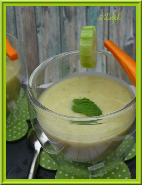 5. A la sonnerie, vous pouvez enlever les feuilles de menthe, j’ai préféré les laisser, saler, poivrer et mettre la crème puis mixer 20sec/Vit7, puis 20sec/Vit8.