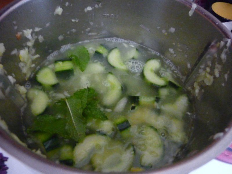 3. Faire suer les oignons à l’huile dans un faitout 2 min sur feu doux. Mettre les concombres, cuire 3 min en remuant. Ajouter le bouillon et 4 brins de menthe, cuire 20 min à couvert.