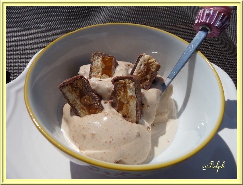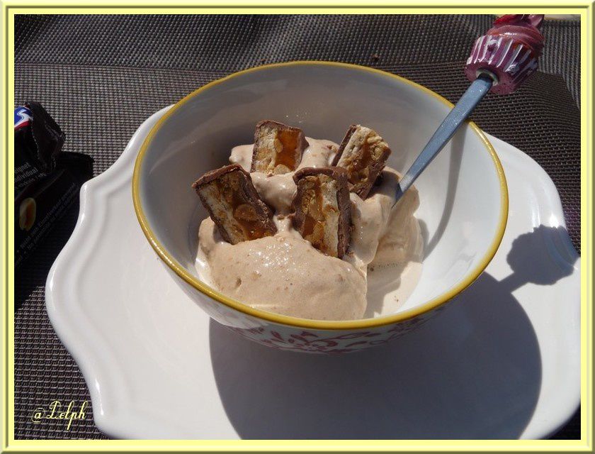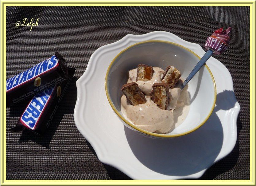 J’ai pris la recette de Glace et Sorbet, j’ai juste ajouter un Snickers pour plus de gourmandise, puis je l’ai adapté à mon Thermomix.