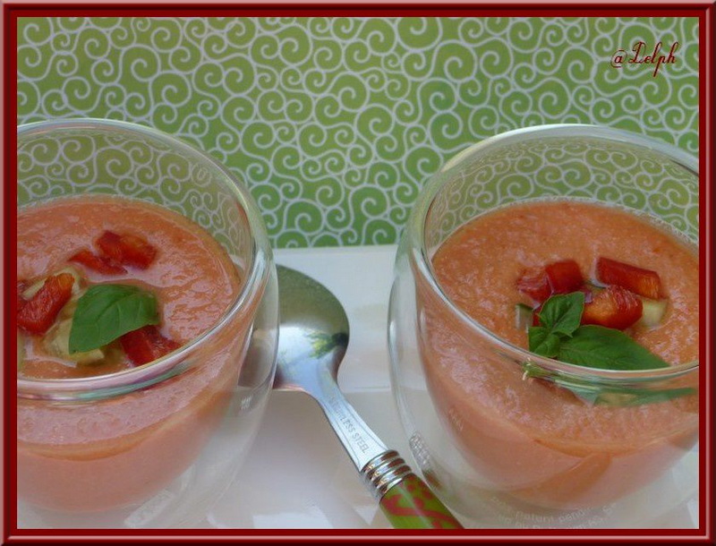 Dés qu’il commence à faire beau j’aime préparer des gaspacho, je trouve que cela fait une entrée bien sympathique. Si vous aimez cela, je vous conseille aussi le gaspacho de tomates et fruits de la passion, il est excellent avec des notes fruitées exotiques, cela change.